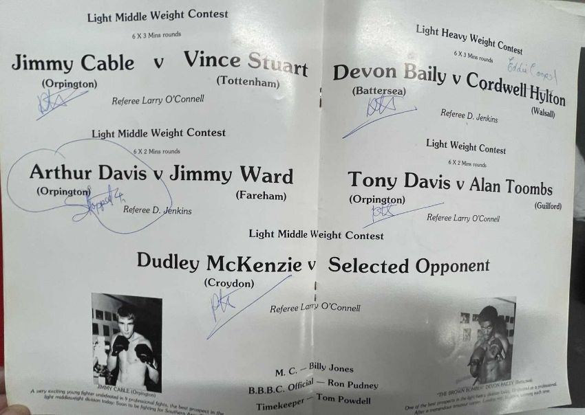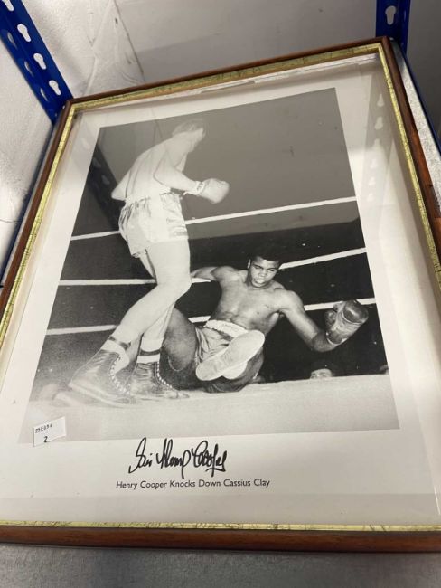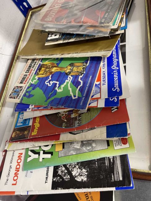 Sporting Memorabilia: Signed photograph of Sir Henry Cooper framed and glazed, signed copy of an autobiography Minter, a thank-you letter signed by Alan Minter and his coach Doug Bidwell, a fan club magazine, boxing magazines from the 1980s, The People boxing guide boxing programmes from around the country, plus World Cup Championship England 1966 and other football programmes, England, Arsenal, Man Utd, etc and a Larry Holmes belt buckle.