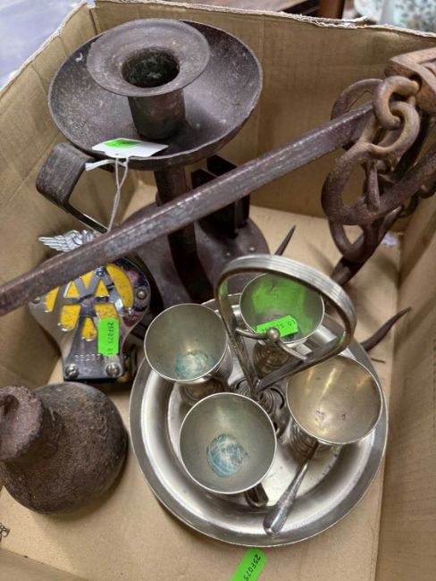 Metalware: an early 20th century chamberstick by Hugo Berger for Goberg, with integral matchbox holder. Marked 'Goberg' to the underside, 19cm high; a set of beam scales, believed to have come from Styles of Devizes; an egg cruet and an AA badge.