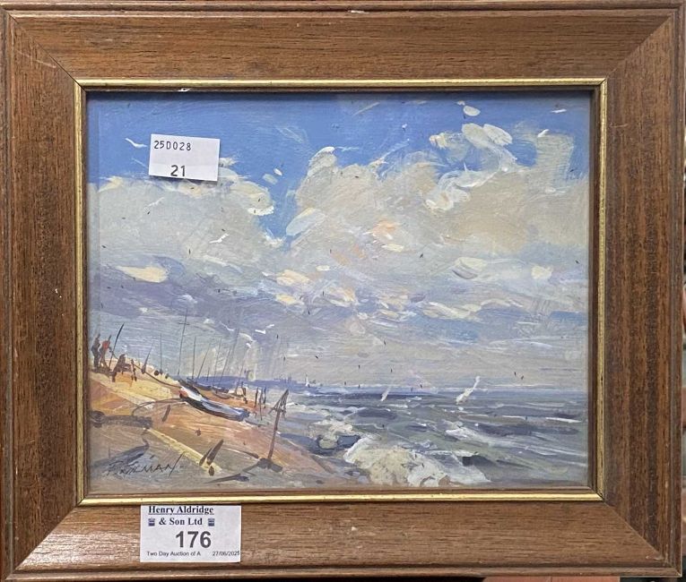 Peter Gillman (British 1928-1984): Gouache on board Aldeburghe seascape with beach and figure, signed lower left, exhibition label verso, oak framed and glazed, 8ins x 5ins.