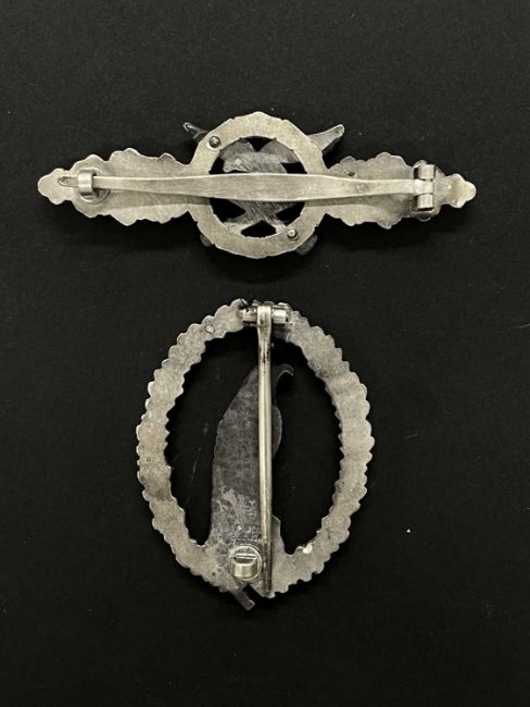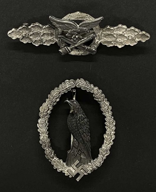 Militaria: WWII Luftwaffe retired pilots badge marked Junker Berlin. WWII Luftwaffe close combat clasp.Please note we do not guarantee German WWII listed items to be genuine period examples. Bidders should view these items in person to decide for themselves as to their age and authenticity. No returns will be accepted for these items.