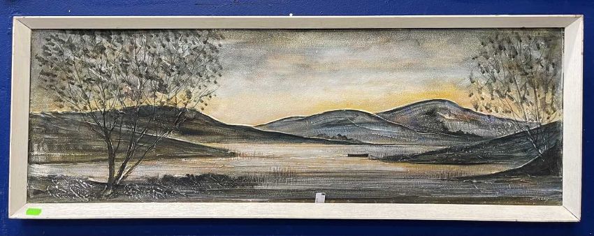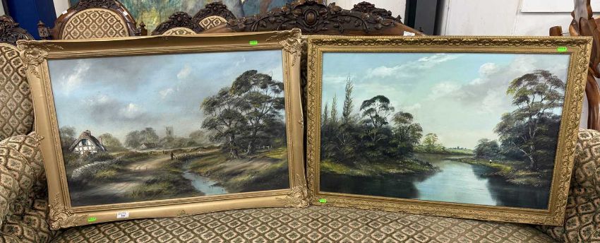 Paintings. Two oil landscapes by Digby Page depicting blue skies, foreground trees, streams and figures. Visible canvas sizes 75cm x 50cm. Also, mid-century low horizon painting by Jack Kay 90cm x 30cm.