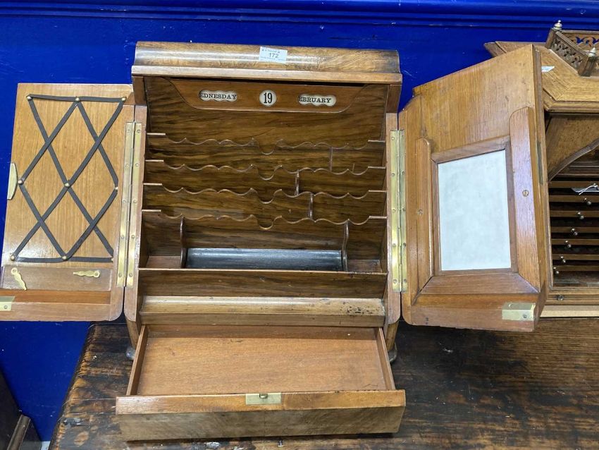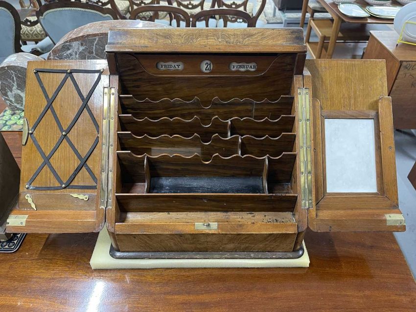 Writing Requisites: 19th century figured walnut stationery box with drawer beneath and perpetual calendar, multiple letter racks, 15ins x 14ins x 11ins.