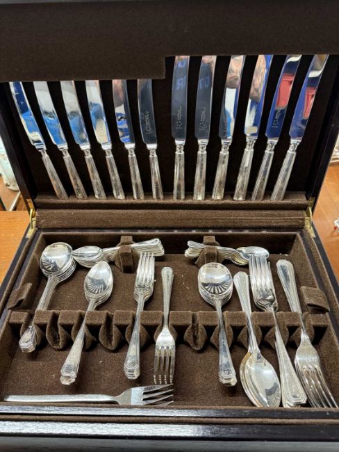 Silver Plate: an Arthur Price part cutlery set in stained wooden case, together with a pair of two branch candelabra, 34cm high.