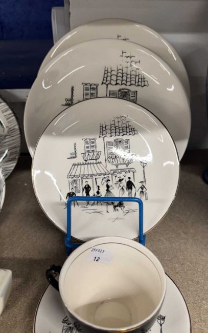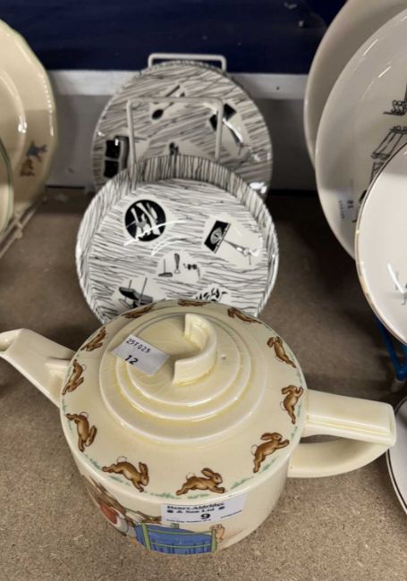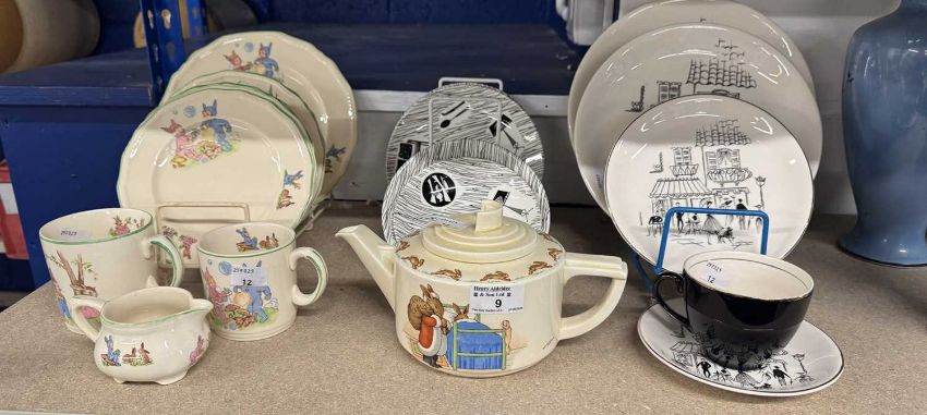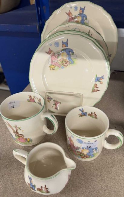Ceramics: Royal Doulton Bunnykins teapot, Alfred Meakin Pixie Ware dinner plate, three tea plates, two soup bowls (1 A/F), two mugs, cream jug, Parisienne Range three dinner, one breakfast, tea plate, cup and saucer, Ridgway Homemaker three tea plates, two saucers and one cereal bowl.