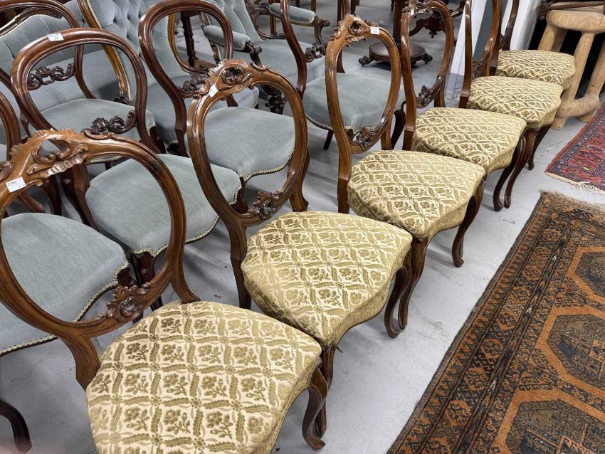 Furniture: 19th century walnut upholstered balloon back dining chairs x 6, carved cresting rail cabriole front supports.