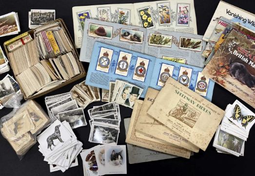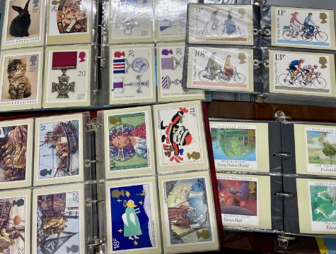 Stamps: GB Dependencies, British Islands, nine albums of Jersey, Guernsey, Channel Islands and Isle of Man mint stamps with original presentation packs, plus a box of various cigarette and trade cards, mostly loose, and four albums of PHQ cards.