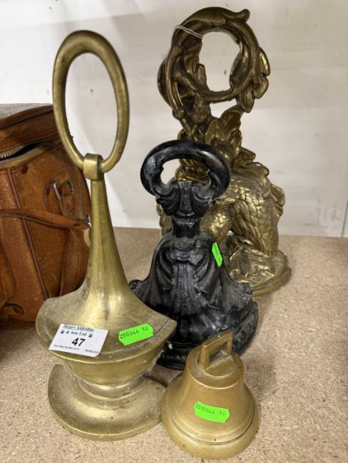 Metalware: three 19th century door porters, one modelled as a pair of partridges on the ground, 30cm, together with a small brass bell marked 'Geiranger'.