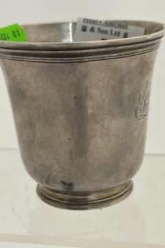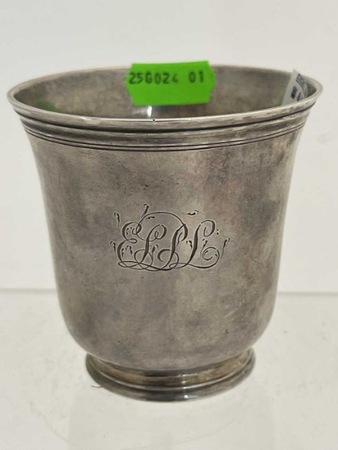 Silver: an 18th century Channel Islands silver beaker, the bell-shaped body raised on a shallow, circular foot and engraved with the initials 'PLP' to one side and illegible Gothic initials to the other. A double reeded band beneath the flared rim, the underside stamped three times with the maker's mark, 7.6cm high, 114g. An old repair to the rim, minor ripples but generally good.