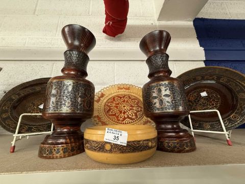Treenware: Polish miner's strike of 1980s in Piast, Wujek, the miners made Folk Art to supplement their income in the form of plates, bowls, vases, turned, carved, coloured and stained, the plates often with matching patterns. (12)
