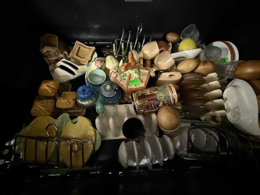 Ceramics: a Carltonware novelty 'legs' toast rack, a Hovis toast rack, three further Carltonware examples, plus ten others from Shelley and other factories including silver plated, together with a selection of novelty cruet sets and eggcups.