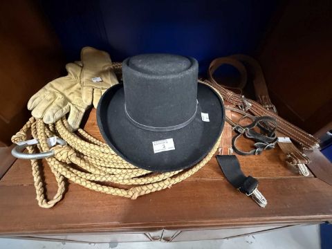 Americana: North American cowboy equipment including a plaited leather lasso, 'Resitol' Texas cowboy hat (new), a pair of mule skin gloves, a set of leather three point braces and a pair of spurs.