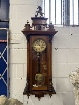 Clocks: 19th century stained oak Vienna striking wall clock, 134cm long with pediment x 43cm wide.