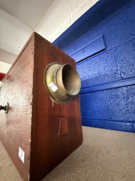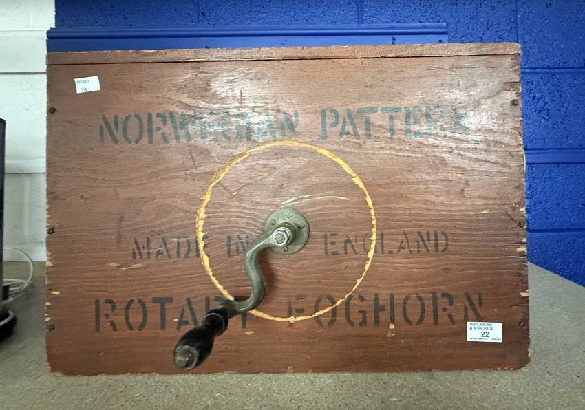 Maritime/Nautical: Early 20th century Norwegian Pattern rotary foghorn, made in England, in a treen case. 55cm x 37cm.