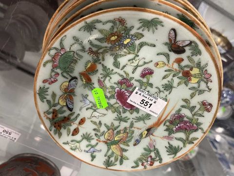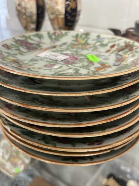 Oriental: a set of eight late 19th or early 20th century Canton celadon plates, enamelled in typical fashion with birds, insects and flowers, each 18.5cm diameter.