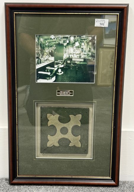 R.M.S. OLYMPIC: First-Class Barber's shop floor tile, framed and glazed. The tile measures 15cms x 15cms