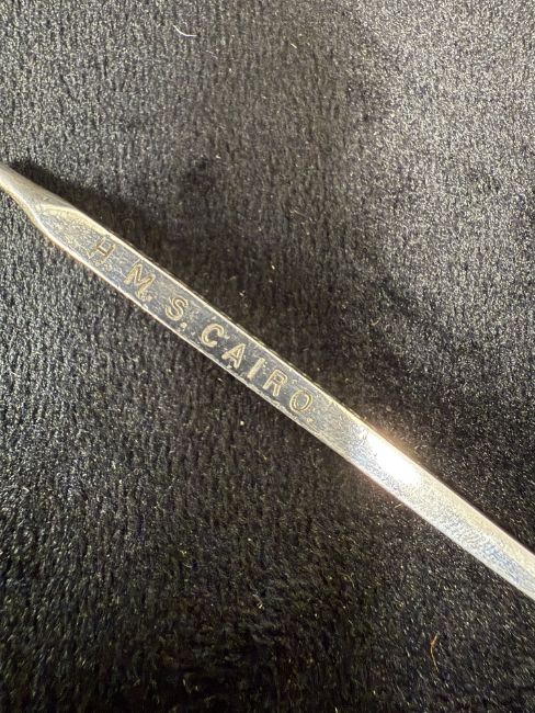 MARITIME: George V hallmarked silver militaria, H.M.S. Cairo presentation oar for 1933 Cruiser Regatta Veterans Officers Skiff, NAAFI (Navy, Army and Air Force Institute), Birmingham 1933, length 15cm, approx. 13.9g.