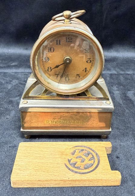 WHITE STAR LINE: Brass desktop clock with indistinct engraving R.M.S. Ceramic 10cms plus a Harland and Wolff time keepers board (2)