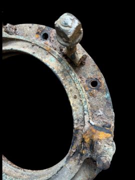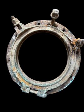 WHITE STAR LINE: R.M.S. Laurentic brass porthole. Laurentic was sunk by a German mine in January 1917 with the loss of 354 souls and 34 tons of gold. This porthole was recovered by Ralph Williamson working on behalf of then owner Ray Cossum. The lot is sold with a signed COA. 53cms