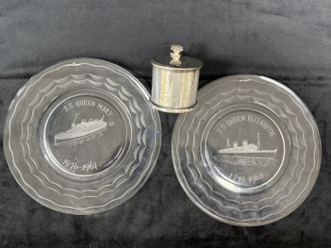 OCEAN LINER: Elkington plated mustard pot with blue glass liner. Engraving to the front “Recovered by Diver from S.S. Oceana Sunk in 15 Fathoms off Eastbourne March 16th 1912. 7cms. Plus a pair of commemorative plates for the Queen Mary and Queen Elizabeth.