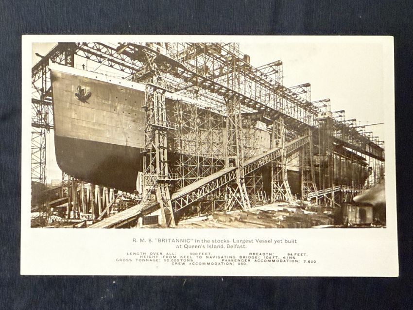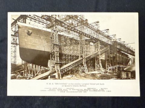 R.M.S. BRITANNIC: Unusual postcard in sepia of Britannic in the stocks at Harland and Wolff.