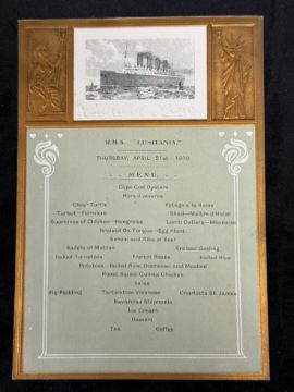 R.M.S. LUSITANIA: First-Class dinner menu Thursday April 21st 1910.