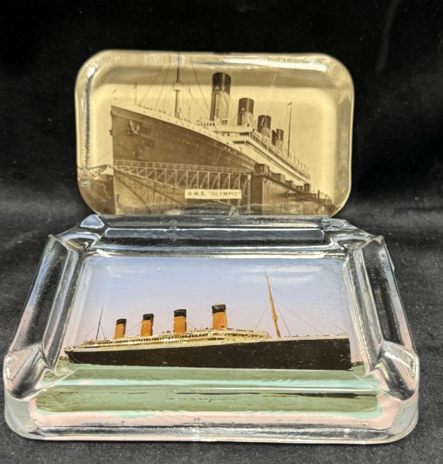 R.M.S. OLYMPIC: Glass paperweight depicting a sepia image of the liner, 10cms. Plus a 1920s glass ashtray showing the liner at sea, 12cms.