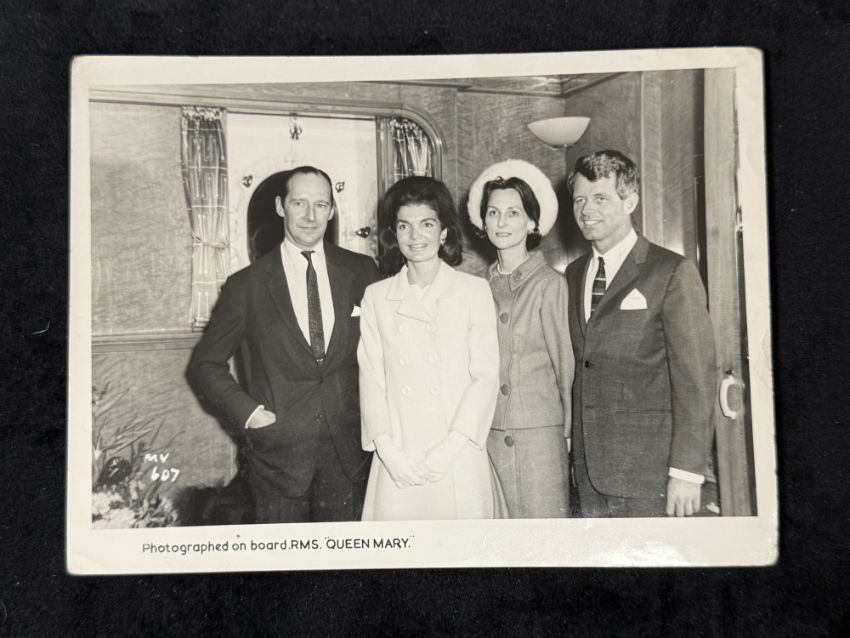 R.M.S. QUEEN MARY: Photograph of Senator Robert Kennedy (right) and Mrs. Jacqueline Kennedy (2nd from left) visiting the liner Queen Mary March 17th 1961 in New York to wish "bon voyage" to former British Ambassador to the United States, Lord Harlech and his wife as they left for London, Lord Harlech, 46 was a close friend of the late President Kennedy and Ambassador to the US since October, 1961. 16cms x 13cms