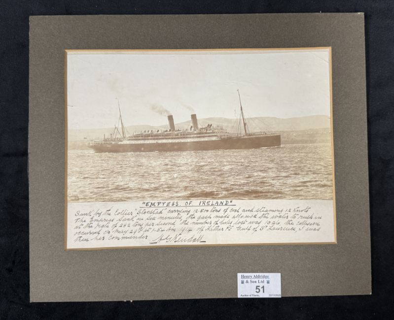 OCEAN LINER/CANADIAN PACIFIC: Captain Kendall’s personal photograph of the lost Empress of Ireland with his manuscript description of the disaster — which is totally at odds with official Inquiry findings. Famous as “The Man Who Caught Crippen” (the infamous London cellar murderer), Captain H. G. Kendall moved from that triumph — in the S.S. Montrose — to the soul-destroying tragedy of the Empress of Ireland just over four years later. This is his personal portrait of the the lost Empress, about which he never spoke publicly — and mention of which he notoriously omitted from his memoirs, Adventures on the High Seas. The photograph, with his personal subscript, hung on a wall beside the stairs in his Merseyside home — and was there when he died in a nursing home in 1965, aged 91. Nurses said he had repeatedly mentioned the Empress and on his deathbed was writhing in horror at apparent shipwreck. A unique opportunity to acquire a stunning image of one of the three greatest shipwrecks of the Golden Age — with the Empress trailing only Titanic and Lusitania in fascination — one that moreover personally belonged to her world-famous Captain. There is simply nothing even near equivalent with Captain E. J. Smith or W. T. Turner, with this item made even more important by Kendall’s handwritten contradictions of Lord Mersey’s findings. The subscript reads: “Empress of Ireland”Sunk by the collier “Storstad”, carrying 12,500 tons of coal and steaming 12 knots. The Empress sank in six minutes, the gash made allowed the water to run in at the rate of 282 tons per second. The number of lives lost was 1,026. The collision occurred on May 29th at 1.54am 1914 off Father Pt, Gulf of St Laurence [sic]. I was then her Commander. H G Kendall The importance of this artefact cannot be overestimated. Kendall said 282 tons of water ingress per second, to the Inquiry’s 265 (p. 601 of the report). The Captain writes that the Empress sank in only six minutes, whereas the Inquiry found ‘About 15’ (p. 593). Wireless operator Leslie at Father Point believed it was ‘about ten minutes’. Kendall also differed on the exact time of the collision: the Inquiry estimated it at one minute later than he (1.55 to 1.54), while Leslie put it nine minutes earlier. The speed of the Storstad is cited as twelve knots by Kendall, who was confronted with her in the fog, yet Lord Mersey estimated 10 kts. The Captain of the Empress puts the number of lives lost at 1,026, fourteen more than the 1,012 found by Lord Mersey.Photograph shows the Empress in the very St Lawrence seaway where she foundered just before World War One. This image has never been published anywhere before. An extraordinarily significant document in Canadian and British maritime history. 23cms x 28cms.