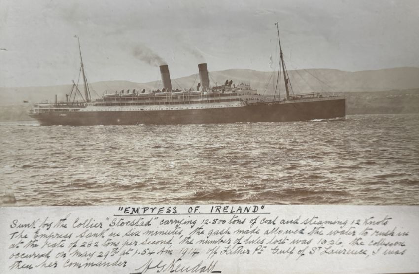 OCEAN LINER/CANADIAN PACIFIC: Captain Kendall’s personal photograph of the lost Empress of Ireland with his manuscript description of the disaster — which is totally at odds with official Inquiry findings.