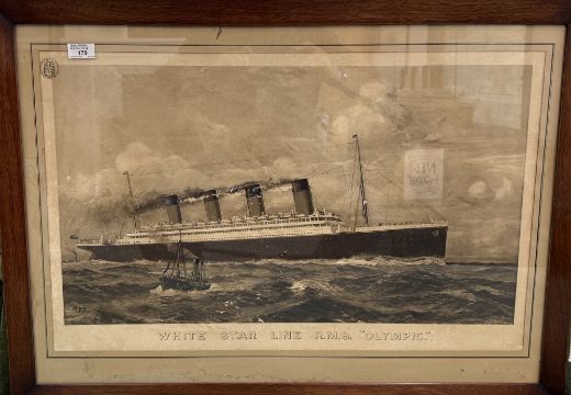 MARITIME ART: Montague Birrell Black (British, born 1884) White Star Line. Olympic Lithograph agents' print in sepia printed by the Liverpool Printing and Stationery Company, 73cms x 47cms.