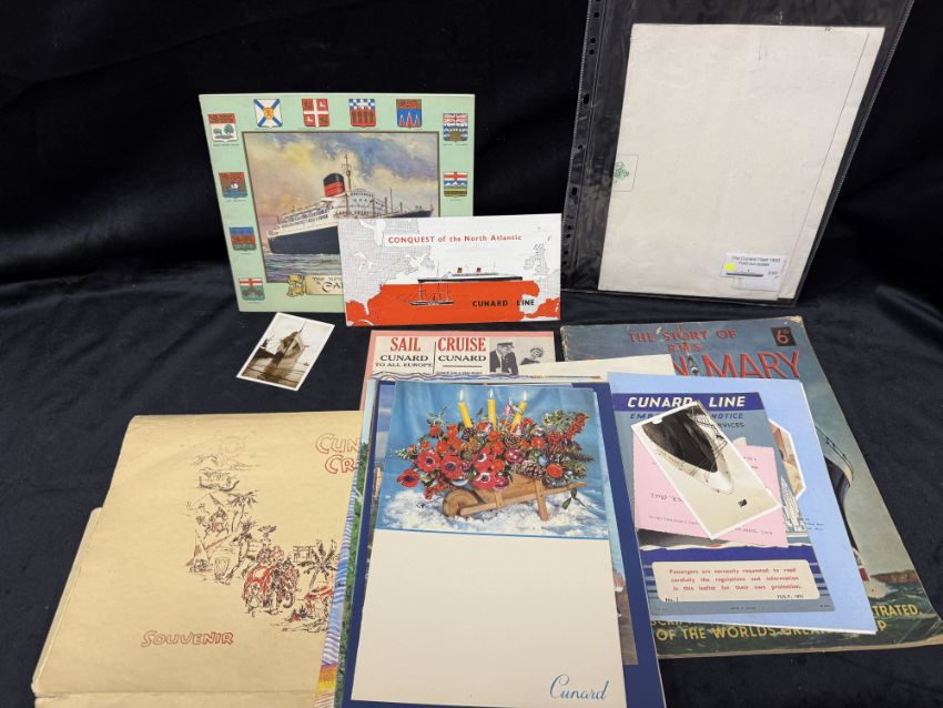 CUNARD: Collection of mixed Queen Mary, Mauretania and other liner ephemera.