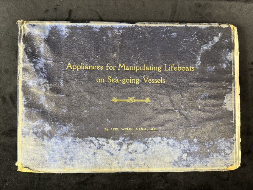 OCEAN LINER: Rare original copy of Axel Welin’s hardbound volume Appliances for Manipulating Lifeboats on Seagoing Vessels 1907 34 x 23cms, some losses plus a replica Daily Mirror April 16thNB Axel Welin studied at the Royal Institute of Technology in Stockholm from 1879 to 1884. Between 1886 and 1888, Welin worked as a weapons designer for Thorsten Nordenfelt in London. In 1889 he started his own engineering firm, the Welin Davit & Engineering Company Ltd. He soon designed the famed Welin Breech. However, his main interest was davits. He invented a new and improved davit for lowering boats on board ship, a quadrant davit for double-banked boats which simply became known as the Welin davit. The R.M.S. Titanic was equipped with Welin davits and after the disaster the demand for his product skyrocketed