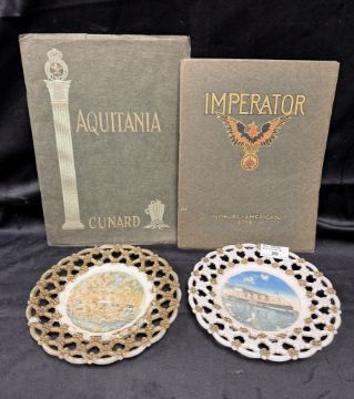 CUNARD: Period milk glass ribbon plates for the Mauretania/Lusitania (2) 18.5cms. Plus R.M.S. Aquitania green ground 32 page brochure promoting the liner, profusely illustrated together with a similar from the Hamburg American Liner Imperator (2) 29cms x 21cms and 20cms x 27cms.